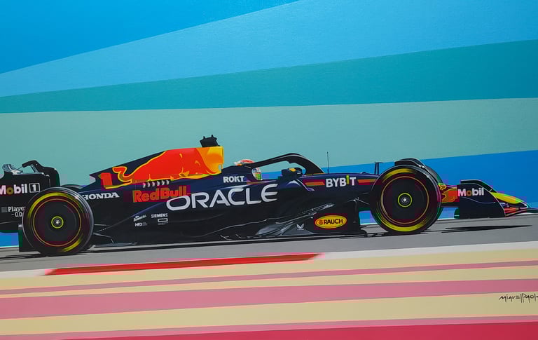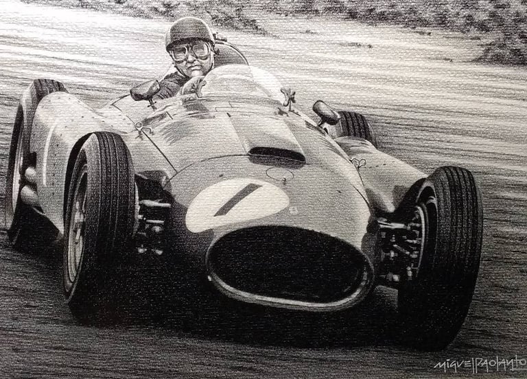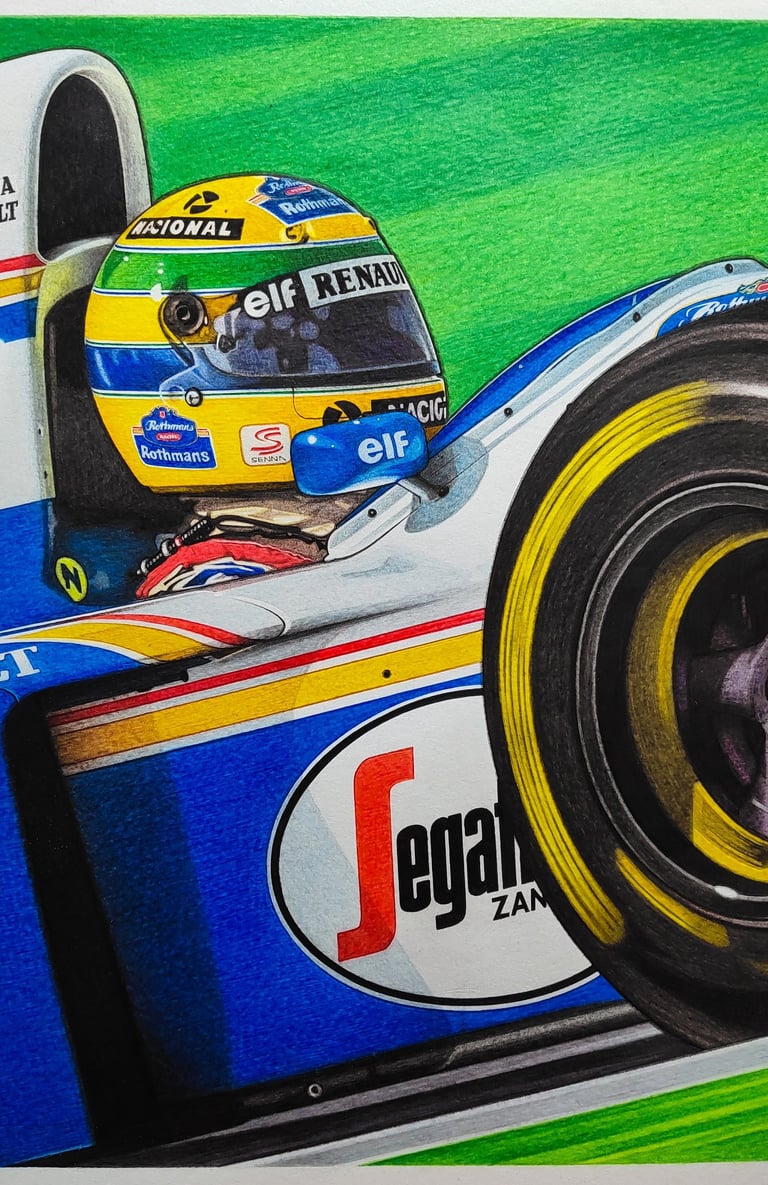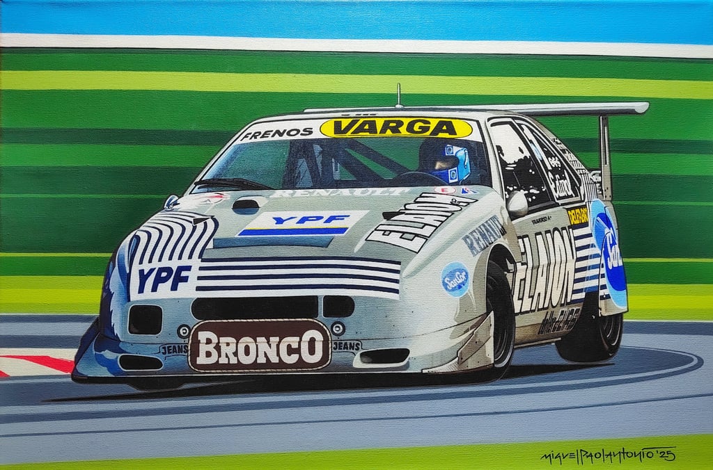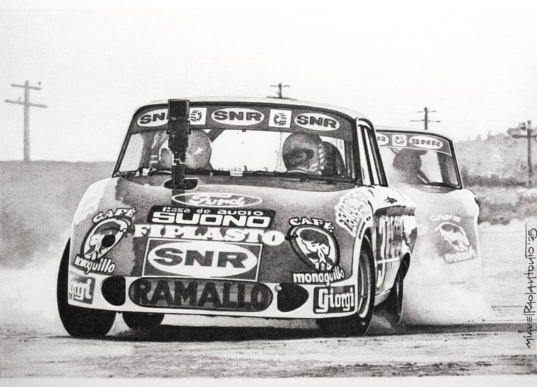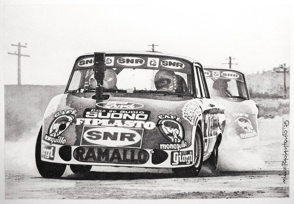 Realizo dibujos con lápices de grafito, policromos y acuarelables, y pinturas acrílicas sobre tela. En cada obra busco transmitir la pasión, la identidad y los momentos que marcaron al automovilismo.